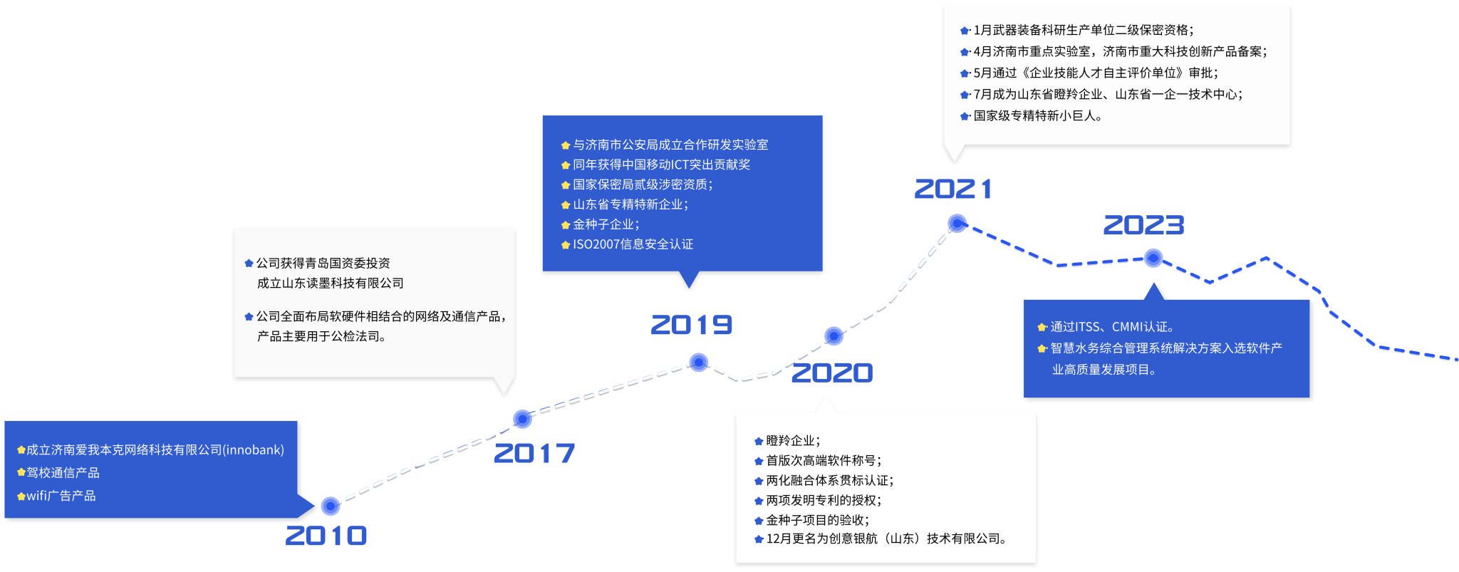 Previous slide Next slide 特种通讯行业解决方案 智能化项目 AI人工智能 大数据管理 软硬件研发 服务领域 Solution 智慧交通 交通实时监控、公共车辆管理、车辆辅助控制、智慧路网、智慧装备 农业信息化 节水灌溉,农作物种植监测,智慧产业园区 水利水务信息化 雨情预警,汛位监测,水资源合理配置 公检法司 公共安全采集系统,视频监控系统 教育信息化 校园安全,访客系统,视频监控系统 医疗信息化 输液监控报警,移动信息采集查询 发展历程 Development History 解决方案 Solution 智慧水务 以数字化为主线,以数字化场景、智慧化模拟、精准化决策为路径,对水利工程实体以及建设、运行管理活动进行数字化映射、与物理工程的同步仿真运行、虚实交互,提升水利工程建设和运行管理,推动水利工程智慧化建设和数字化转型的高质量发展。 智慧交通 通过基本的城市道路交通网络数字孪生,将全市道路分布、卡口网点设备调度纳入全局调控范畴,及时掌握实时交通情况。 高标准农田数字管理平台 以AL人脸识别技术、Al边缘计算技术,云平台服务,大数据分析等新兴技术运用为基础,聚焦校园安全、校园管理、校园数字化、家校沟通等场景,通过边缘端感知识别设备。 智慧校园 以AL人脸识别技术、Al边缘计算技术,云平台服务,大数据分析等新兴技术运用为基础,聚焦校园安全、校园管理、校园数字化、家校沟通等场景,通过边缘端感知识别设备。 AI人工智能解决方案 通过搭配多样化深度学习算法,灵活应对智慧城市商业、能源等场景。 智慧医疗 病区医疗物联网应用,输液完成报警通过输液总量和速度综合计算输液完成时间,通过监测滴斗内单位时间液滴数量计算输液速度过快/过慢报警/输液完成提醒。 新闻动态 News updates CCTV发现之旅频道《未来使命》栏目走进创意银航 近日,CCTV发现之旅频道《未来使命》栏目走进创意银航,采访记录了创意银航以及牛增强先生的创业历史。 巴基斯坦驻华使馆商务参赞一行莅临创意银航 3月10日,巴基斯坦驻华使馆商务参赞Ghulam Qadir 古拉姆•卡迪尔、国民银行中国区首席代表 Shaikh Muhammad Shariq 谢赫•穆哈马德•夏立克、驻华使馆贸易发展官甄瑛、国民银行中国区首席代表助理赵鹏莅临创意银航(山东)... 创意银航荣获国家级 专精特新 “小巨人”企业 是推动公司经济高质量发展的重要动力。 我们在科技创新发展领域深耕多年,能利用自身各方面的资源与政策相结合,期间,企业始终坚持以自主创新为导向,持续为用户提供有价值的产品。 创意银航|创新 创造 价值 成为一家以创新为驱动力的超一流科技公司